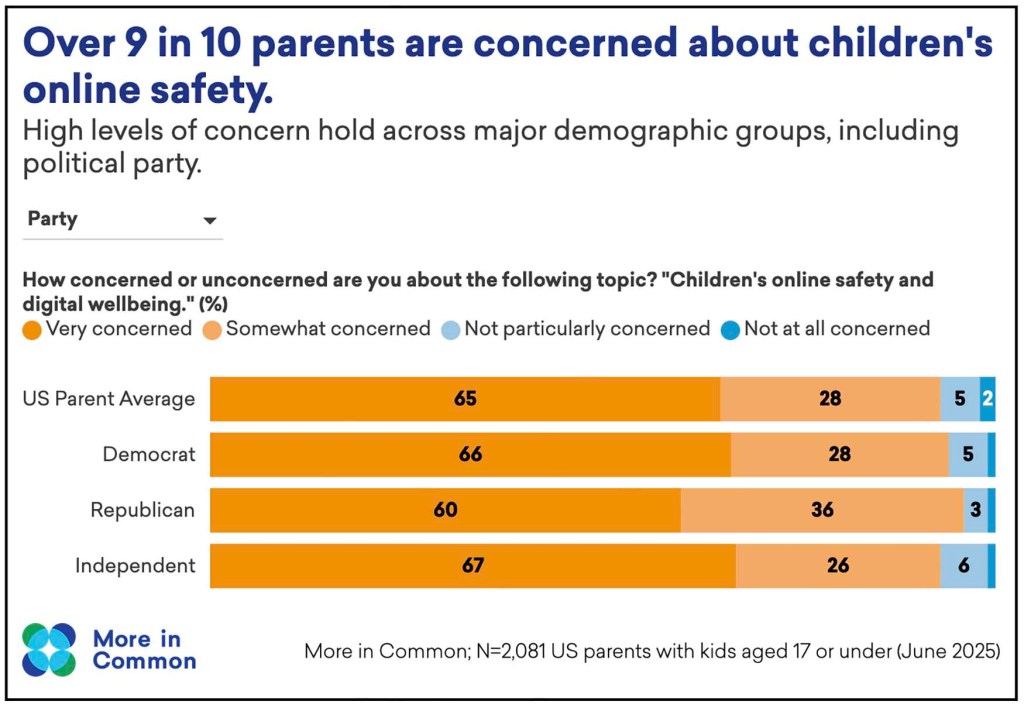 According to More in Common, which recently surveyed parents in the U.S., U.K., France and Poland on their thoughts and experiences around online safety, 65% of U.S. parents are “very” concerned about their kids’ safety online, and another 28% are “somewhat” concerned (leaving 7% of parents not that concerned at all — a troubling number, even if it seems low).