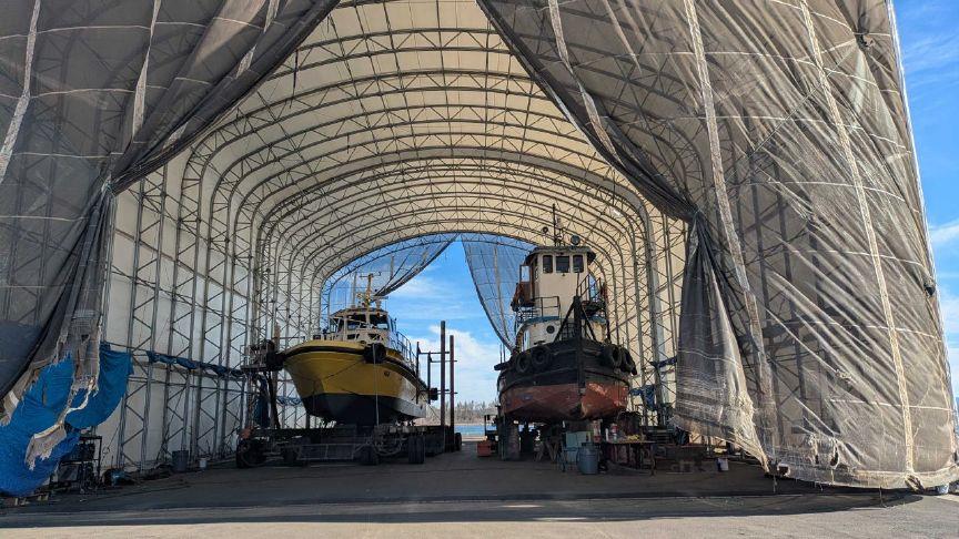 On a sunny day in February, WCT had several vessels staged for repairs at North Tongue Point. Tugs owned by Toristoja rested along a pier.